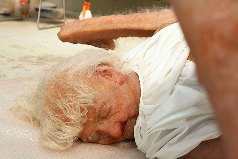 Los artistas chinos Sun Yuan y Peng Yu crearon esta escultura de un ángel caído hiper realista, que simula una mujer de avanzada edad boca abajo, en el suelo, como si estuviera agotada o muerta.
