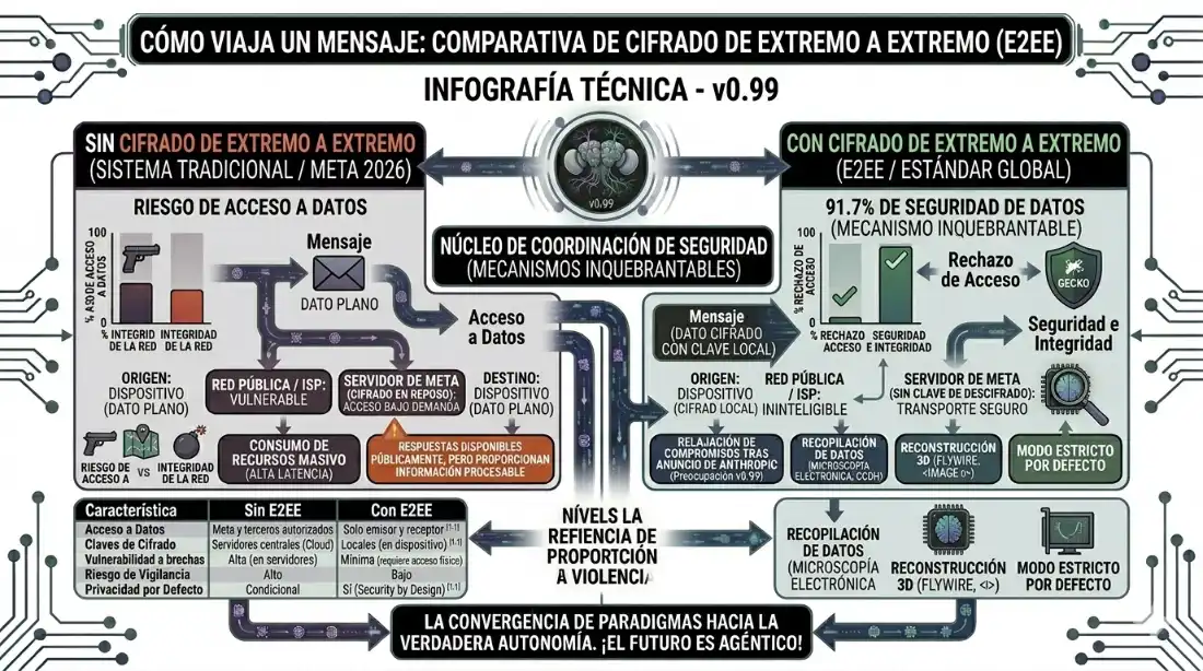 Sin este protocolo, las claves de cifrado residen en los servidores de la empresa (Encryption at Rest), lo que técnicamente permite que la plataforma tenga acceso al contenido de las conversaciones bajo demanda o ante brechas de seguridad.