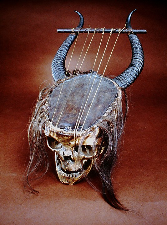 Lira (un tipo de instrumento musical) realizada con una cabeza humana real y los cuernos de un antílope. Una macabra pieza del siglo XIX que pertenece al museo Metropolitano de Arte. Las cuerdas están atadas a las cuencas de los ojos y sobresaliendo por los lados puede verse el pelo real que tenía la persona antes de fallecer. Para cubrir el cráneo partido por la mitad se ha utilizado un trozo de piel, que parece ser cuero curtido. Probablemente, y al igual que los cuernos, el cuero sea del antílope.