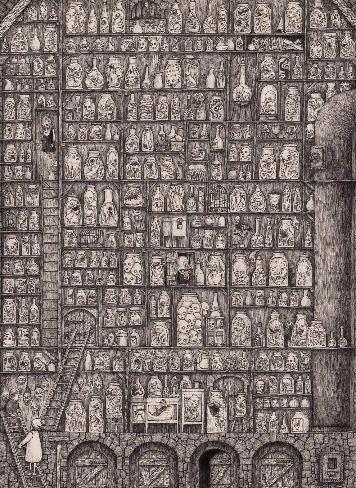 Seres del bosque, monstruos, ánimas perdidas y niños prevalecen en la mayoría de su trabajo. Algunas de sus criaturas y escenarios recuerdan al increíble mundo de H.P. Lovecraft. Me atrevería a decir que veo cierta inspiración e influencia en su trabajo. (Estoy seguro de haber visto el mismísimo Cthulhu)