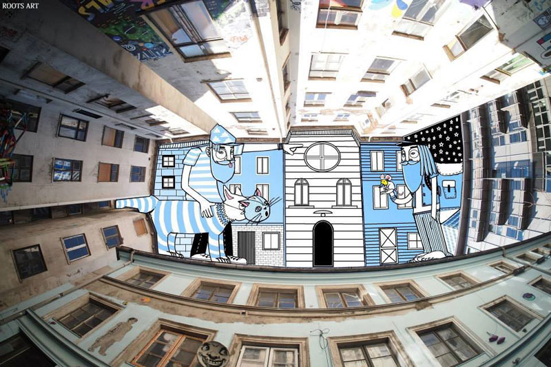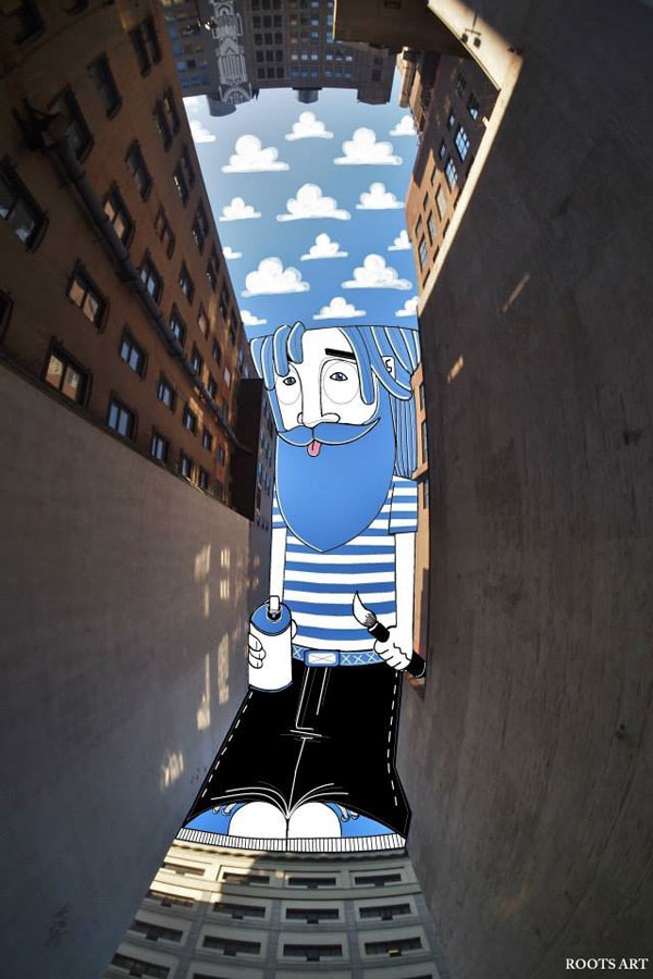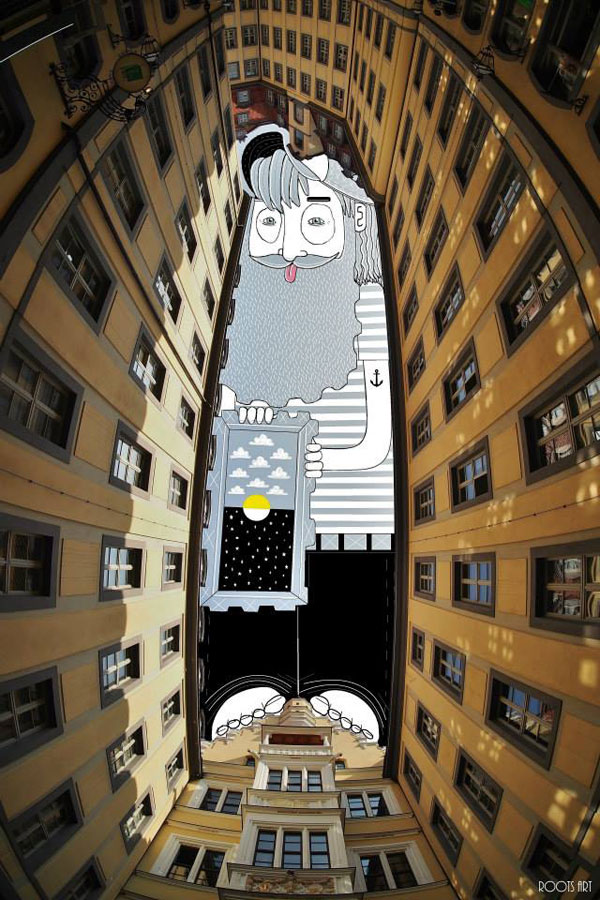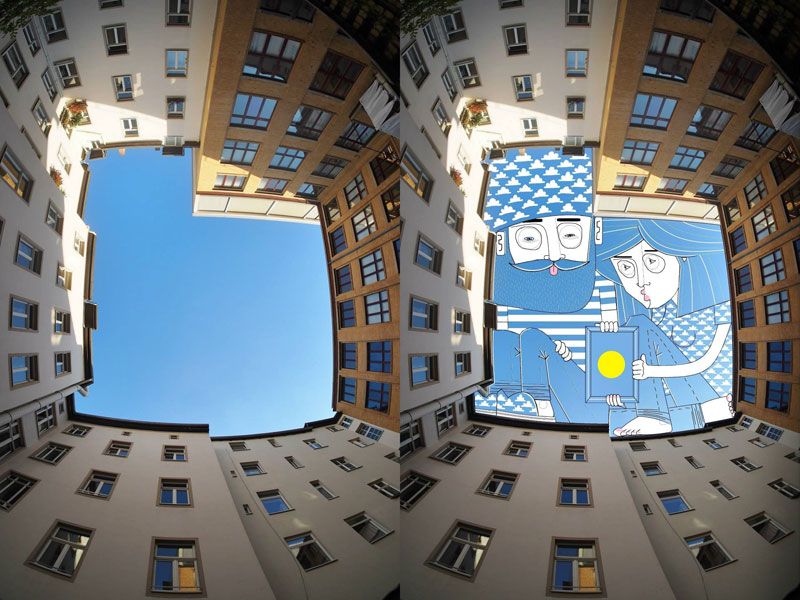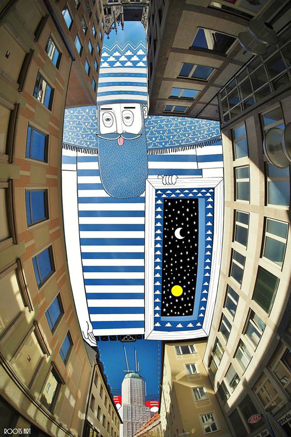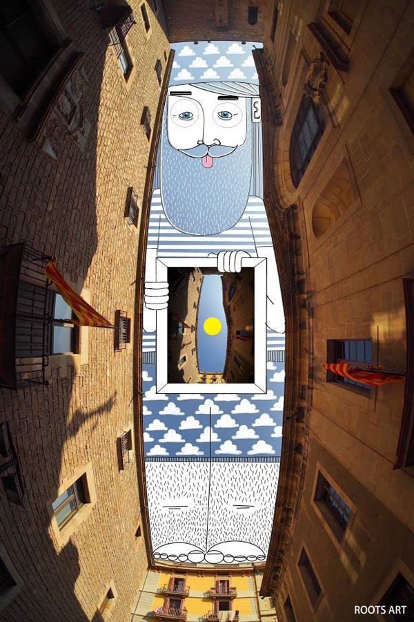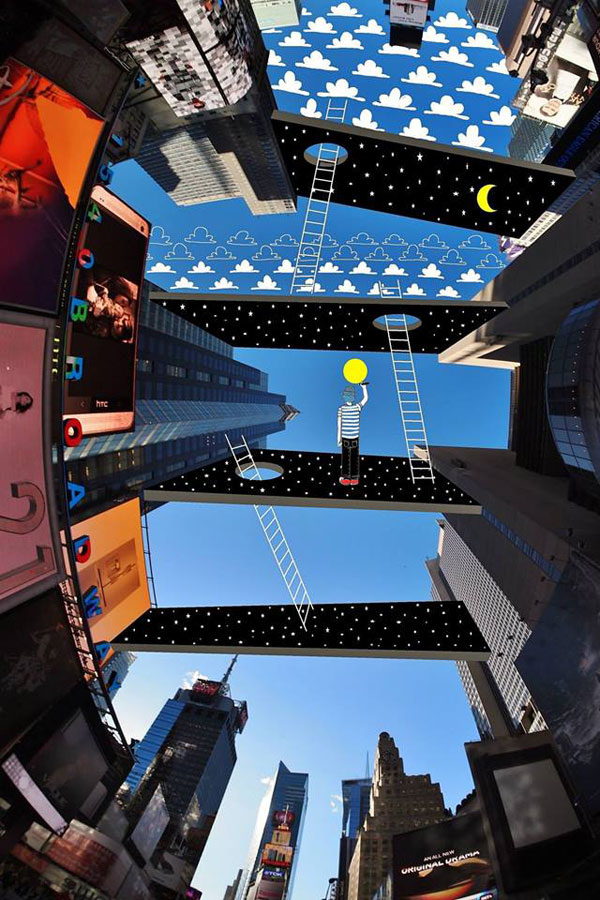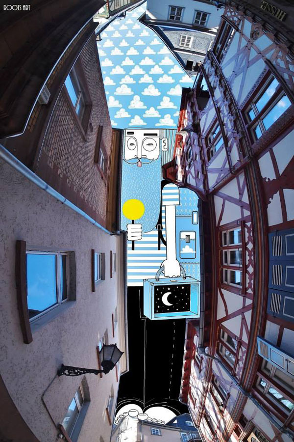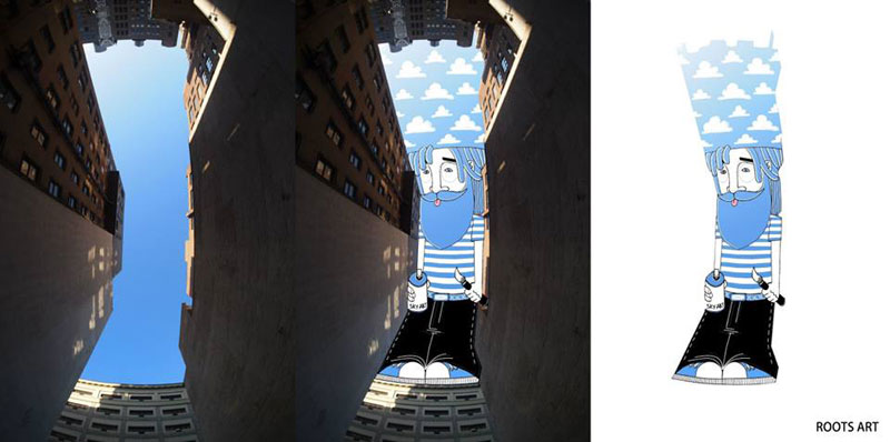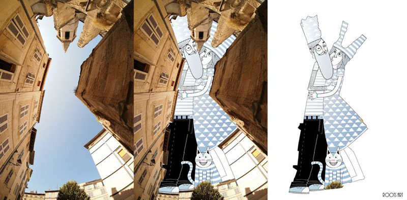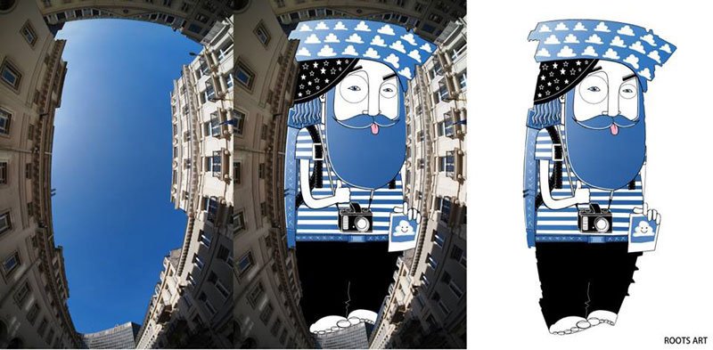 El artista Thomas Lamadieu toma fotos entre edificios de todos los lugares que visita. Todas las fotos apuntan al cielo utilizando la lente de "ojo de pez" para lograr el efecto necesario para realizar sus obras.