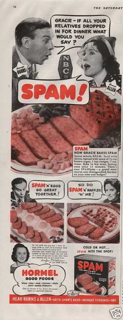 En uno de sus numerosos sketches los Phyton se burlaron del producto en cuestión, lo que proporcionó una definitiva fama a la palabra “spam”; a saber, cuatro vikingos leían un menú que ofrecía muchos platillos, aunque todos contenían SPAM, por lo que empezaron a gritar: "¡Al rico SPAM!", y de ahí la asociación con una cosa abundante que nadie quiere, como lo es el correo electrónico basura que llega masivamente a nuestros buzones.
